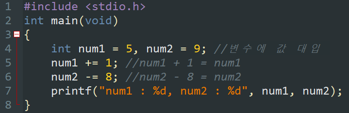 | num1 = -num2; //부호 연산자 사용 num1 -= num2; //복합 대입 연산자 사용 |
