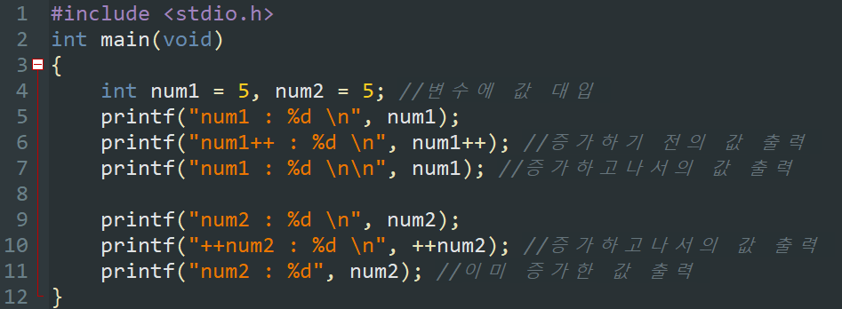 6행에서 증가하기 전의 값이 출력되고 7행으로 넘어가면서 num1값에 1이 증가한다.