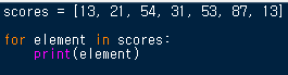 scores 리스트의 첫 번째 요소부터 변수 element에 할당되고 반복 루프 안의