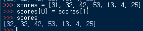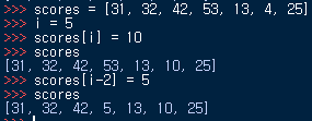 scores리스트에서 번호가 5인 요소에 접근하려면 scores[5]과 같이 적어주면 된다.