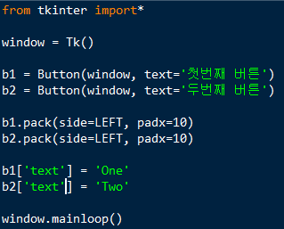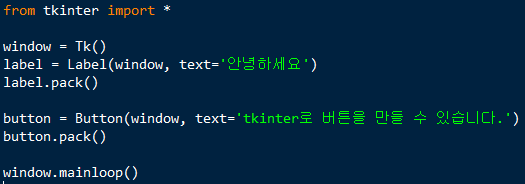 (pack이 호출되어야만 위젯이 화면에 나타난다.) - mainloop() 메소드는 마우스 버튼과 같은 이벤트를 처리하면서 사용자가 윈도우를 닫을 때까지