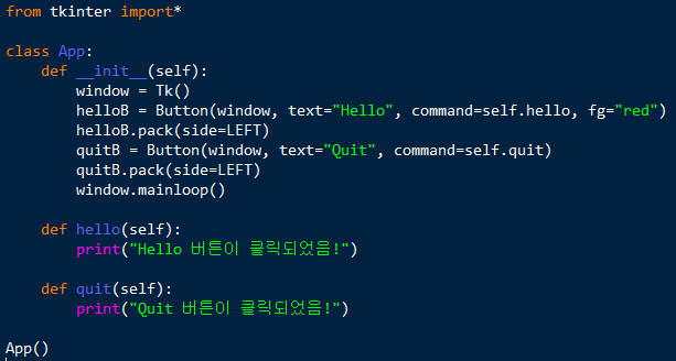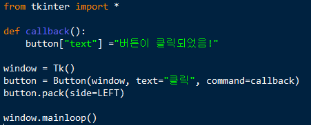 라고 한다. 버튼에 콜백함수를 등록하려면 버튼의 생성자를 호출할 때, command 매개변수에