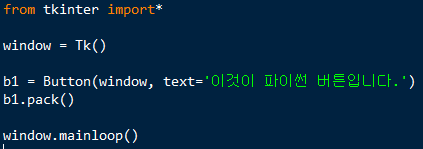 - tkinter을 사용하려면 tkinter 모듈을 포함시켜야 하는데, *는 tkinter 모듈에서 모든 클래스와
