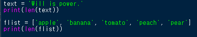 사용할 수 있다. 예를 들어 문자열의 길이나 리스트의 길이는 len()이라고 불리는 함수로