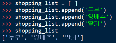 | mylist.append('value') | 리스트의 끝에 'value'요소를 추가한다. |